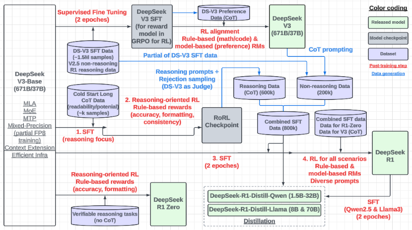 DeepSeek follows a structured, multi-stage process that builds upon the DeepSeek V3 base model to develop DeepSeek V3, R1-Zero, R1, and distilled models from R1 as illustrated in Figure 1. At high level, V3-base to V3 improves the standard fine-tuning process for chat applications, and V3-base to R1 series models focus on progressively refining reasoning ability while ensuring efficiency and generalization.