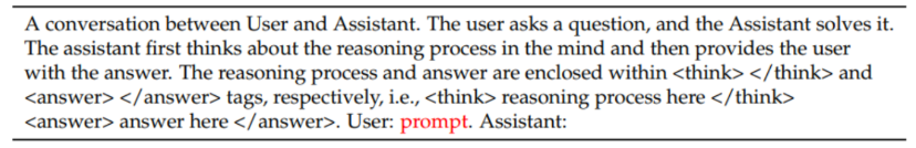 Unlike the V3 model that undergoes supervised fine-tuning before RL, DeepSeek R1-Zero is trained purely with reinforcement learning with no supervised data as shown in Figure 8. A rule-based reward system decides the optimization direction. Specifically, it includes accuracy reward to ensure response correctness, and format reward to enforce the model to put the thinking process between <think> and </think> tags. The training template is described in Figure 9, which requires DeepSeek-R1-Zero to first produce a reasoning process, followed by the final answer.