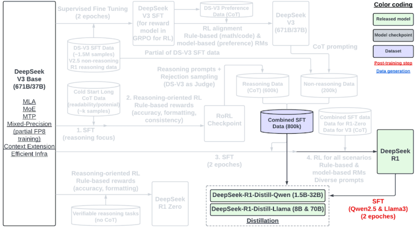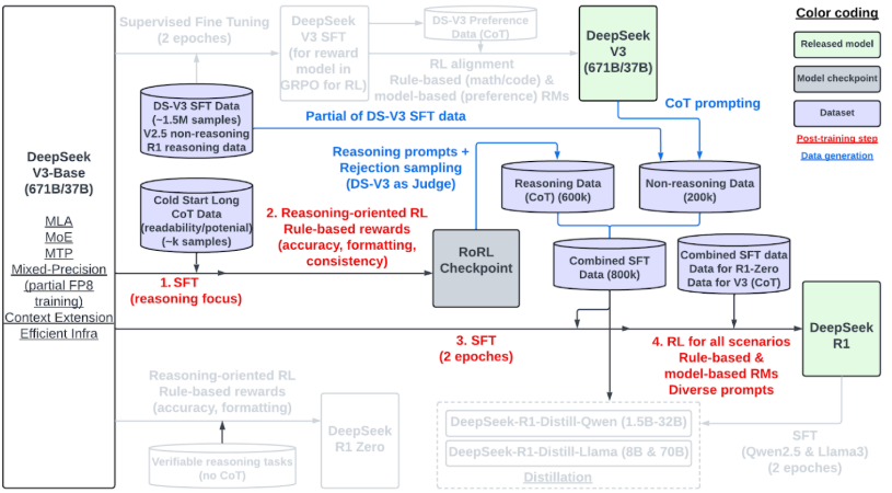- What is the relative development order of V3 and R1 models and who finishes training first? Given that the V3 model was released earlier, it is natural to assume that V3 finished training first. However, the V3 model relies on the R1 series of models for reasoning data during SFT, so R1 must have been in a relatively mature stage to provide such data. One possibility is that the R1 model used to generate the reasoning data for V3 is the RoRL checkpoint in Figure 1. This is the model after the end of the second stage of the 4-stage pipeline for R1 training.
