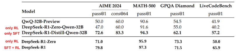 However, DeepSeek-R1-Distill-Qwen-32B, which is distilled from DeepSeek-R1, performs significantly better than DeepSeek-R1-Zero-Qwen-32B across all benchmarks. This suggests distilling reasoning capability from powerful models into smaller models is more effective than gaining reasoning capability through large-scale RL directly with smaller models. The former approach achieves better performance with less compute power. Note that only SFT is used for distillation in this study, the performance could be further improved with SFT + RL for distillation with more compute power requirement.