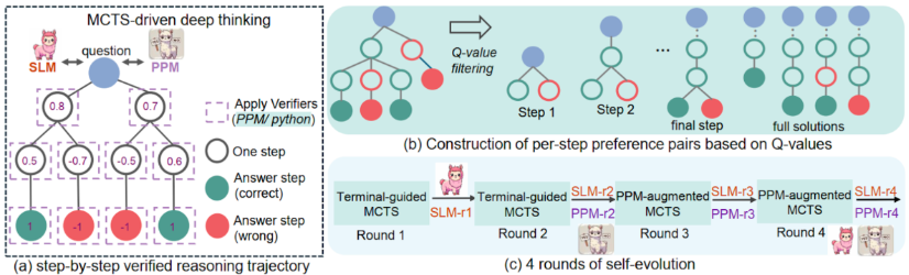 On the other hand, it could be that the RoRL checkpoint is indeed only designed as a data generator to get a better CoT dataset. If we follow this logic, it seems that we could get a higher quality dataset by performing the first two stages (SFT + RL) multiple times with progressive difficulties in questions before the final fine-tuning to get R1. As a result, the R1 performance could be improved further. In fact, rStar-Math[14] tried a similar approach to help small LLMs master math reasoning. It includes four-round of self-evolution with each round using a dataset created from a model checkpoint from the previous round and the starting point of each round is the initial model.