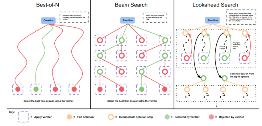 PRM is a learned model (reward or value model) that can evaluate not just final results, but also the intermediate steps or partial solutions leading up to the final answer. In other words, PRM can look at how a solution is being derived step by step and provide reward for each step. Best-of-N, beam search, and lookahead search are three common algorithms that can leverage PRM to make decisions and[15] has summarized the algorithms well in Figure 2 of the reference captured below.