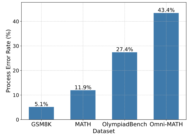 Similarly, a recent paper from Qwen team[17] also confirms that incorrect reasoning steps in the chain-of-thoughts data used in finetuning is common as shown in Figure 17. And[17] mitigates this situation by developing a consensus filtering mechanism that effectively integrates Monte Carlo estimation with LLM-as-a-judge, and advocates a more comprehensive evaluation framework that combines response-level and step-level metrics. So PRM still has the potential to improve LLM reasoning, but more research is needed to reach an effective solution.