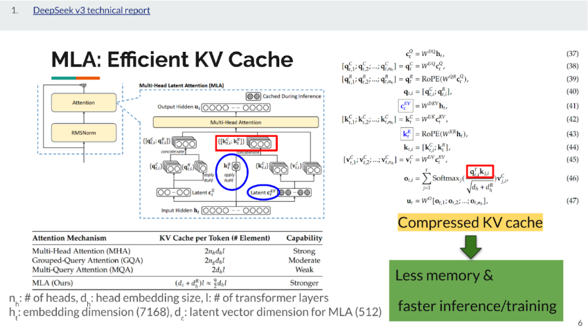Solution: MLA reduces KV cache size (embedding dimension 7168 → 512), enabling faster inference with lower memory overhead.