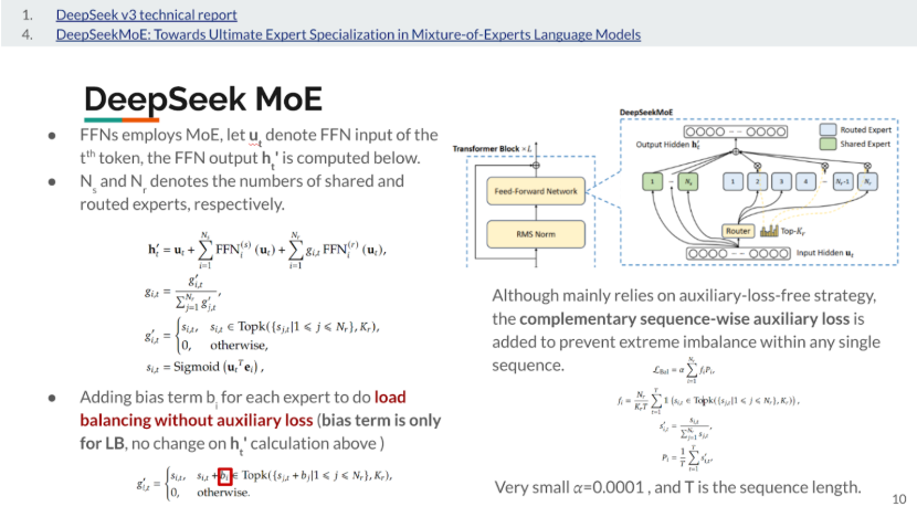 DeepSeekMoE (Mixture of Experts)[5] uses finer-grained experts selection strategy with shared experts and routed experts, and it is applied to all 61 FFN layers except the first three layers. Concretely, each MoE layer consists of 1 shared expert and 256 routed experts, of which 8 experts will be activated for each token. Load balancing scheme is essential for MoE models to mitigate routing collapse. Instead of using conventional solutions that rely on auxiliary loss to avoid imbalanced load with some performance penalty, DeepSeek proposed an auxiliary loss-free load balancing strategy to achieve better trade-off between load balance and model performance. A complementary sequence-wise auxiliary loss is added to prevent extreme imbalance within any sequence with very small weight α = 0.0001.
