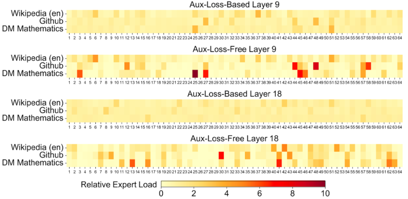 As depicted in Figure 3, the bias term is introduced for each expert and added to the corresponding affinity score to determine the top-K active experts for each token. During training, at the end of each step, the scheme decreases the bias term by γ if its corresponding expert is overloaded, and increases it by γ if its corresponding expert is underloaded, where γ is a hyper-parameter called bias update speed. During pre-training, it is set to γ = 0.001 for the first 14.3T tokens, and to 0.0 for remaining 500B tokens. Through the dynamic adjustment, DeepSeek-V3 keeps balanced expert load during training, and achieves better performance than models that encourage load balance through pure auxiliary losses. As shown in Figure 4, further investigation of the expert load uncovers that the auxiliary-loss-free model shows greater expert specialization patterns than the auxiliary-loss-based one. The relative expert load denotes the ratio between the actual expert load and the theoretically balanced expert load.