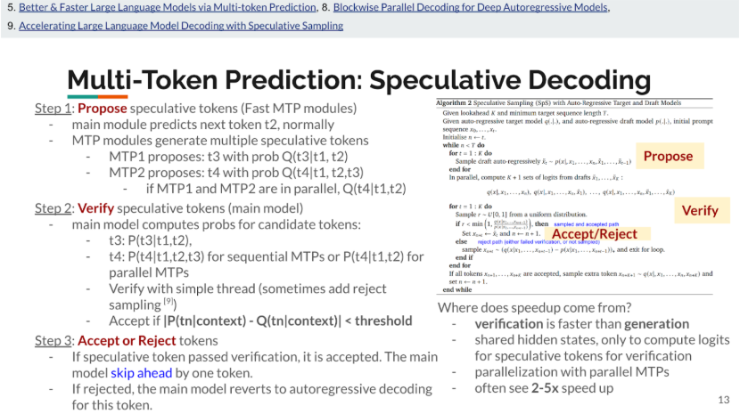 MTP can also speed up the inference process via speculative decoding, in both sequential and parallel architecture[6][7][8]. As detailed in Figure 5, the speculative decoding process consists of three main steps: Propose → Verify → Accept/Reject. In DeepSeek's model, the speculative decoding with only 2-token MTP achieves 1.8x speed up during inference with 85%-90% acceptance rate for the speculative second token. Other work also reports speed up from 2-5x with different numbers of speculative tokens.