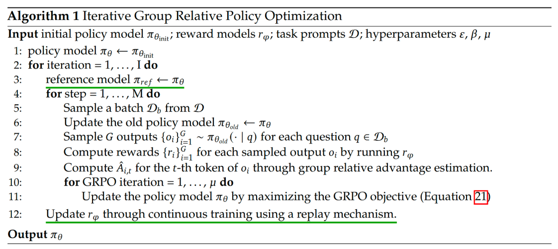 The paper details an iterative version of GRPO, which updates the reference model and reward model periodically to handle distribution shifts as shown in Figure 3.